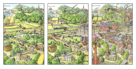 This activity is based on three reconstruction drawings in a KS3 book I edited for the first National Curriculum and published in 1993 by OUP – Expansion, Trade and Industry by Jon Cresswell and Peter Laurence. The three drawings show the same place in the 1750s, 1830s and 1890s and were used to introduce the topic of the Industrial Revolution. Over the years teachers have remembered these drawings but forgotten where they came from – so now you know! – so I thought I’d add them to the website with some suggestions for using them, though there must be many other ways of doing so.