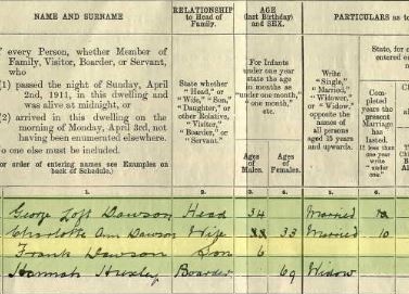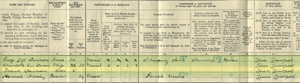 The 1911 census had one original and revealing feature – prompted by concern over infant mortality it asked people to identify the number of children born to a family, both children living and those who had died. The document below shows the entry for my grandparents, George and Charlotte Dawson, revealing that they had two children living but had also had two children who had died since their wedding in 1900.