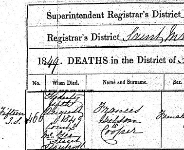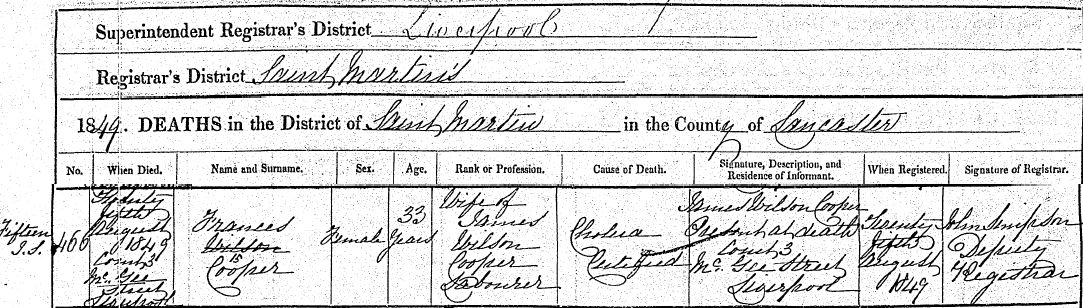 Her name was Frances Cooper, wife of James, mother of 3-year-old John and Fanny, who was just a few months old. They were living in a court off McKee Street, Liverpool, sharing a toilet and water from a pipe in the street with everyone else in their court. That summer, cholera killed over 7000 people in Liverpool. One of them was Frances. She was 33 years old. As you can read on her death certificate below, Frances died on 25th August, which also happens to be my birthday.