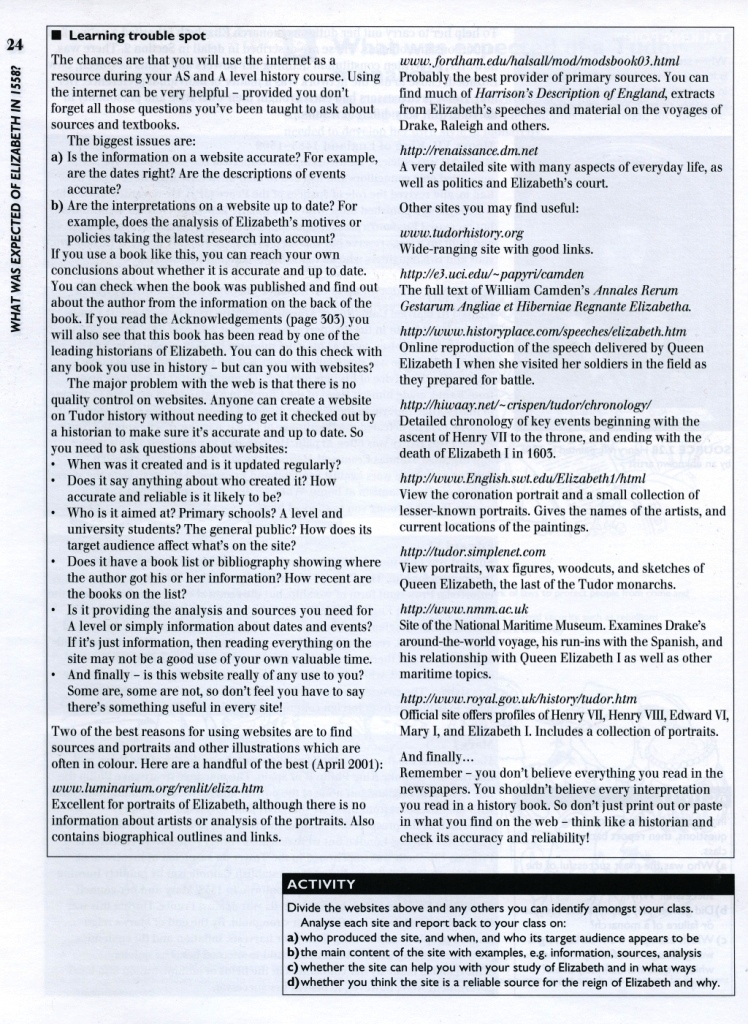In case it’s of use see HERE for a page from an A level book on Elizabeth I that tried to help students develop a critical approach to websites.