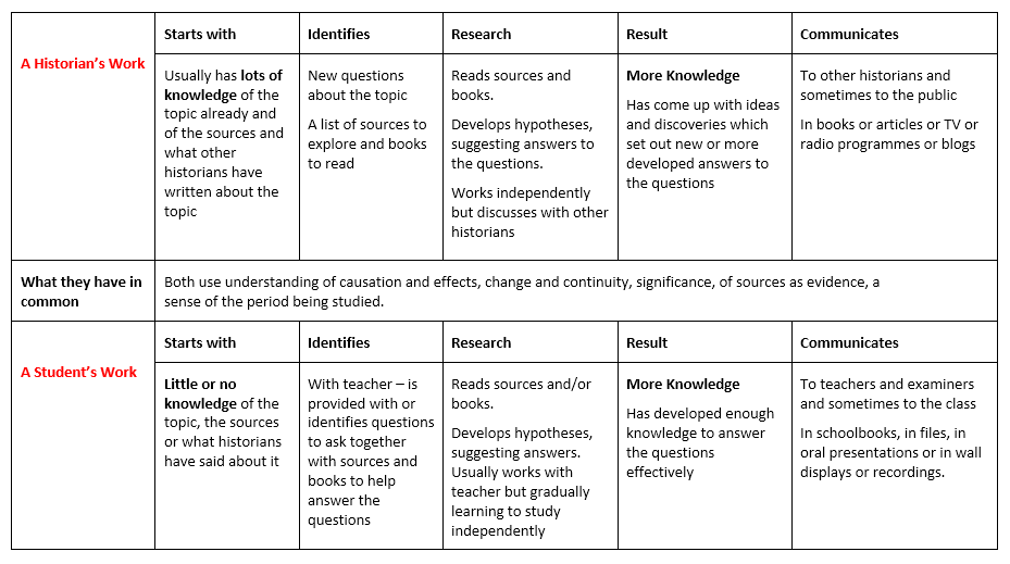 Studying the process of ‘doing history’ explicitly is essential if students are to understand the nature of the discipline and, as importantly, to study with increasing independence as they mature. The answer to the question in the title may seem obvious – objectives abound in examination courses but therein lies a problem. For years the individual parts of the process (e.g. understandings of the nature of evidence) have been artificially separated for assessment purposes, creating the danger that students do not see the bigger picture of ‘doing history’. Can they explain in a few sentences what historians do and, separately, how they themselves progress from knowing little or nothing about, say, the Norman Conquest, to knowing a substantial amount more? Those questions lead to a third – do students need to be clear on the similarities and differences between what they do as they explore a topic and what historians are doing in their work?