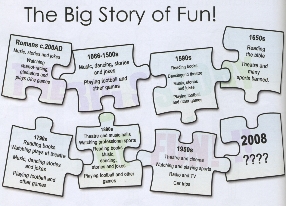 One way to do this is to use the analogy of a jigsaw which tells a thematic story in miniature. This example could be used early in Y7 to help pupils grasp the idea – it’s not one of the major stories but one element of the story of everyday life – the story of fun across time!