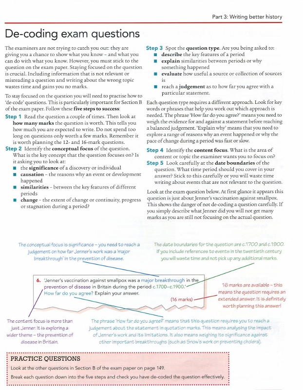 • Organisation and communication of ideas: Has the student used paragraphs to organise their work effectively? Is the piece of writing coherent? Does it show a developed historical vocabulary?